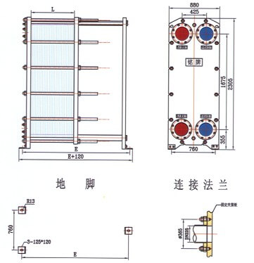 框架包括一個(gè)固定壓緊板和一個(gè)活動(dòng)壓緊板,由上導(dǎo)桿與下導(dǎo)桿支承,在另‘端有一支柱。壓制成的波紋板片懸掛在兩板之間的上導(dǎo)桿上,移動(dòng)活動(dòng)壓緊板將板片組壓緊,再用一組夾緊螺柱將固定壓緊板和活動(dòng)壓緊板夾緊至一定尺寸。兩種介質(zhì)經(jīng)固定(或活動(dòng))壓緊板上法蘭孔流入由波紋板片組成的各自通道,熱交換后介質(zhì)再由固定(或活動(dòng))壓緊板上的法蘭孔流出。同定壓緊板、活動(dòng)壓緊板、支柱及導(dǎo)桿均為低碳鋼??紤]到用戶(hù)的多種使用要求,框架設(shè)計(jì)有多種型式,主要有雙支撐框架式和常用的落地式等,也可根據(jù)用戶(hù)的要求更改框架的型式。